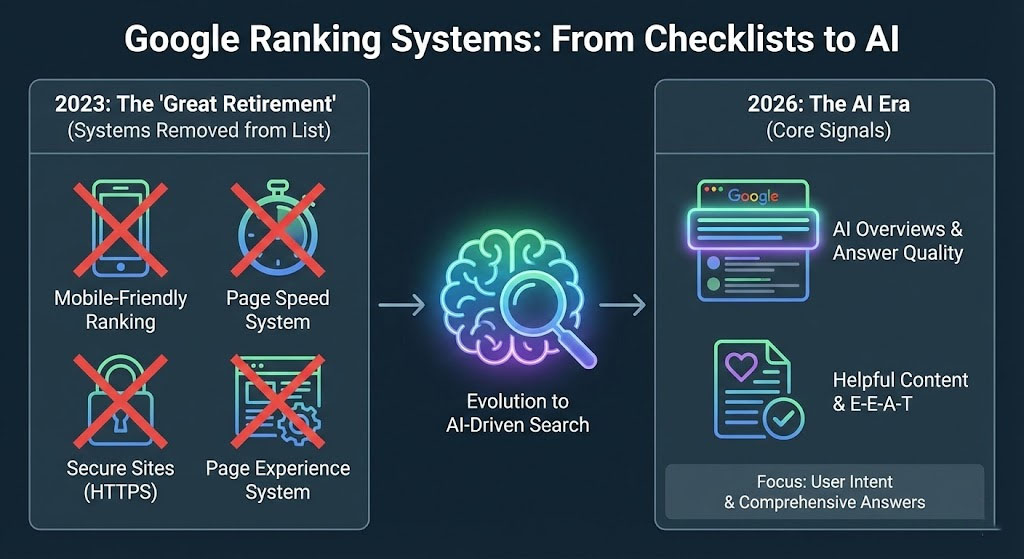 While Google previously removed specific systems from its public documentation (see below), they didn’t disappear—they became part of the core “brain” of Google Search. In 2026, the focus has shifted from checking boxes (like “is it mobile friendly?”) to Answer Engine Optimization (AEO).